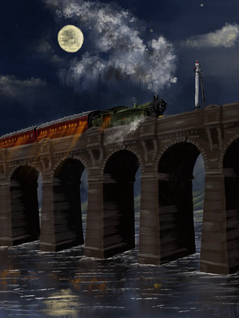 West Country viaduct by moonlight, painted in digital oils.